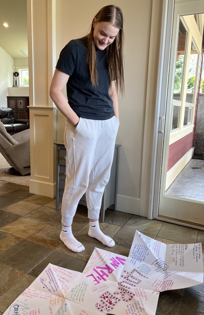 During Spring break, Lauren was supposed to join a team of volunteers to participate in a trip to Mexico and spend some time at an orphanage. Unfortunately, traveling to a foreign country is not an option, so she had to forego the trip. On the day of the team’s departure, Lauren went to see them off, and they gave her a gift basket with the idea that she could open one gift per day for the duration of the trip. Upon the team’s return, she received a large card with individual well-wishes from the kids and staff at the orphanage.